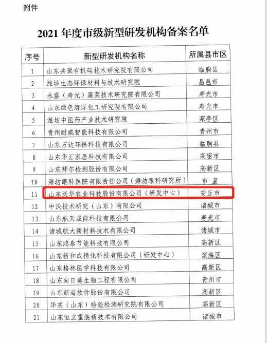 沃华研发中心获评2021年度潍坊市新型研发机构